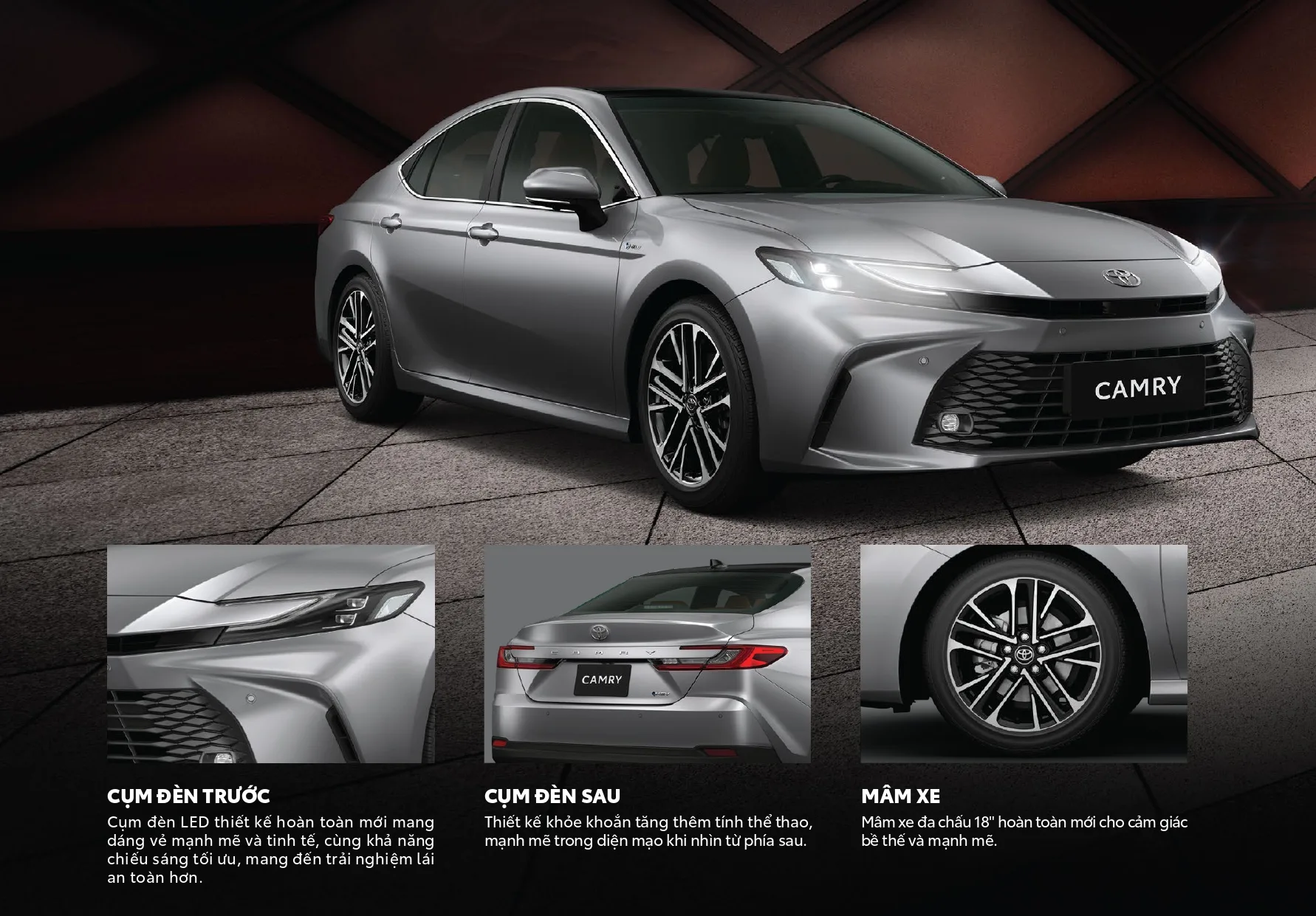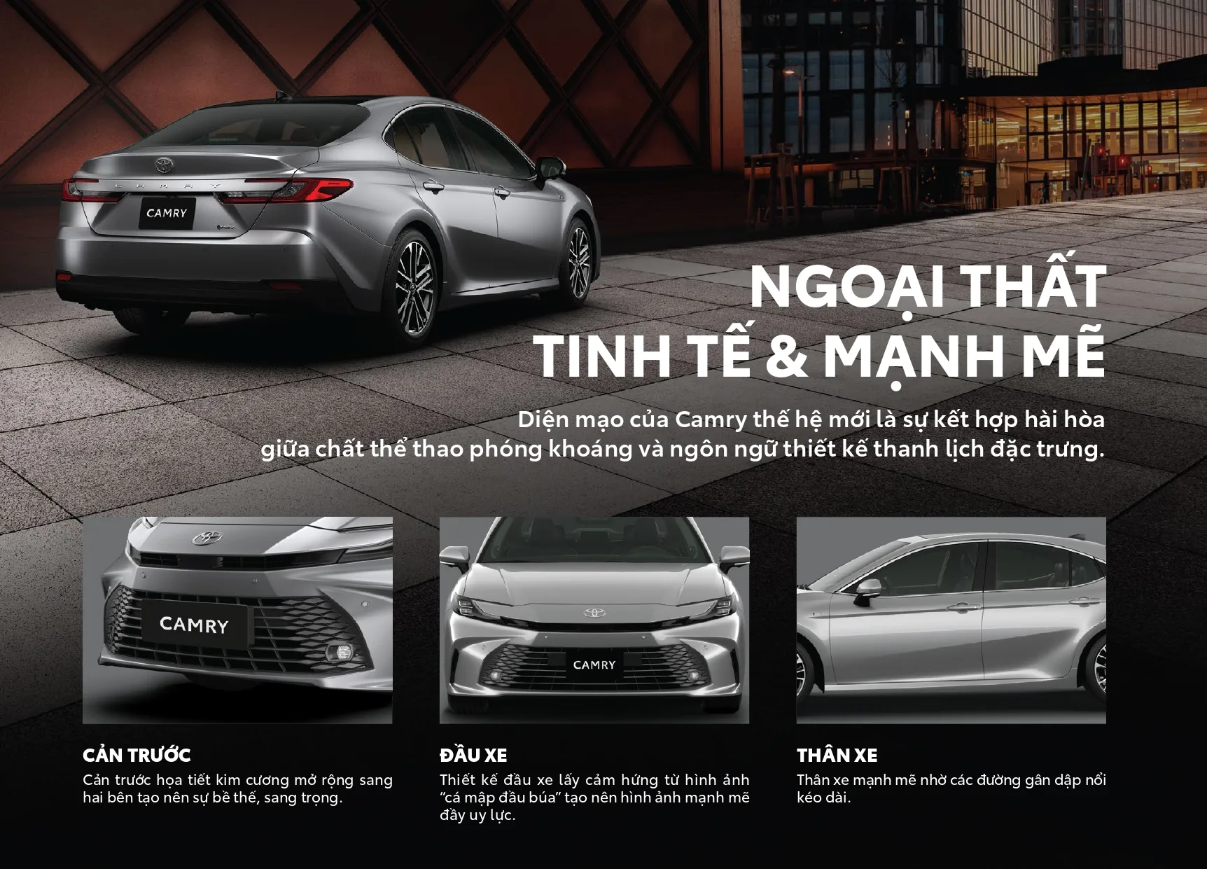 Đèn trước nổi bật với tạo hình chữ C thanh mảnh, cảm hứng từ mẫu Prius hybrid. Lưới tản nhiệt phía trước hình thang ngược vẫn là đặc trưng của Camry, nhưng trên phiên bản này được thu hẹp vào giữa, không tràn ra hai hốc hút gió như trên bản trước.