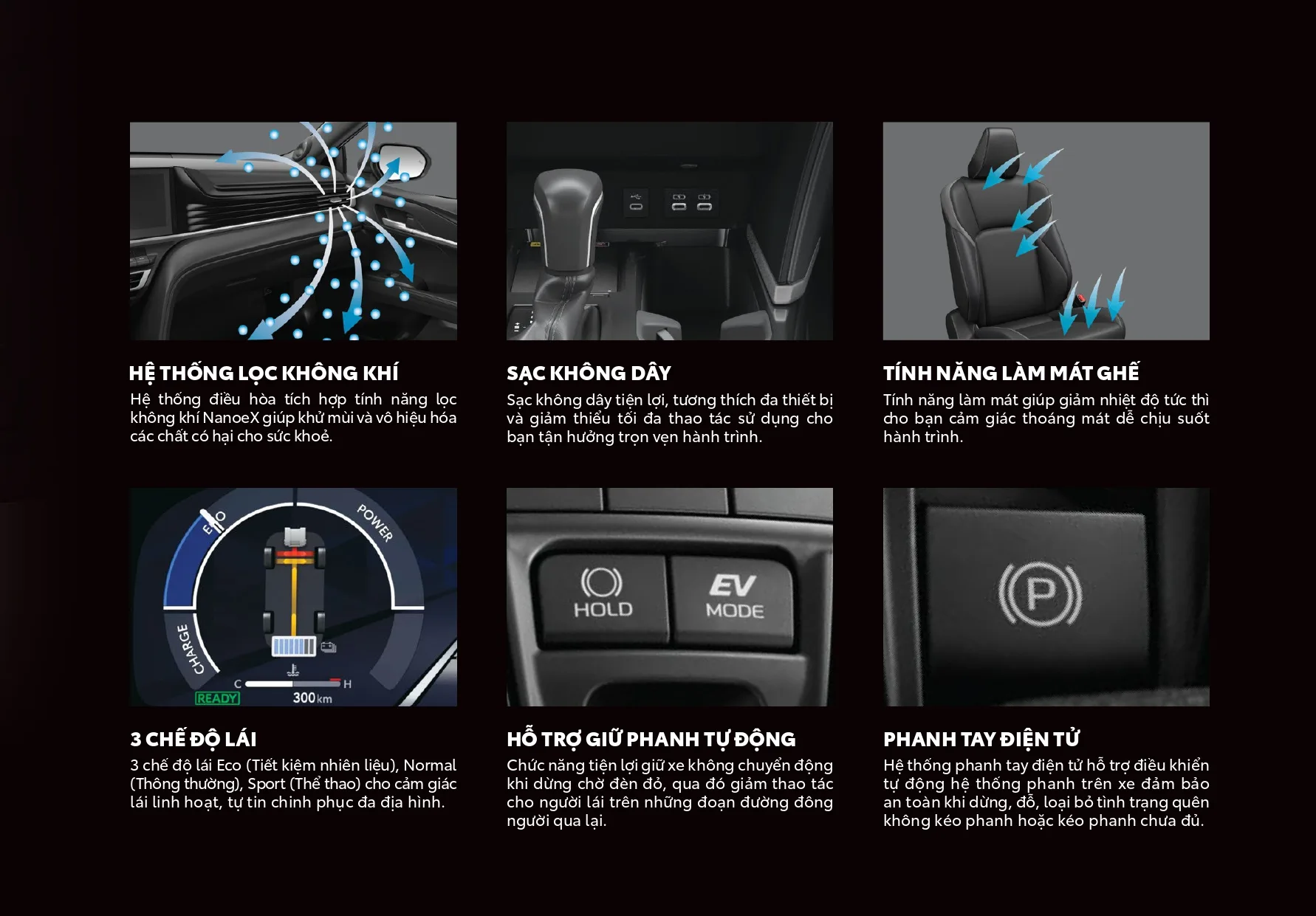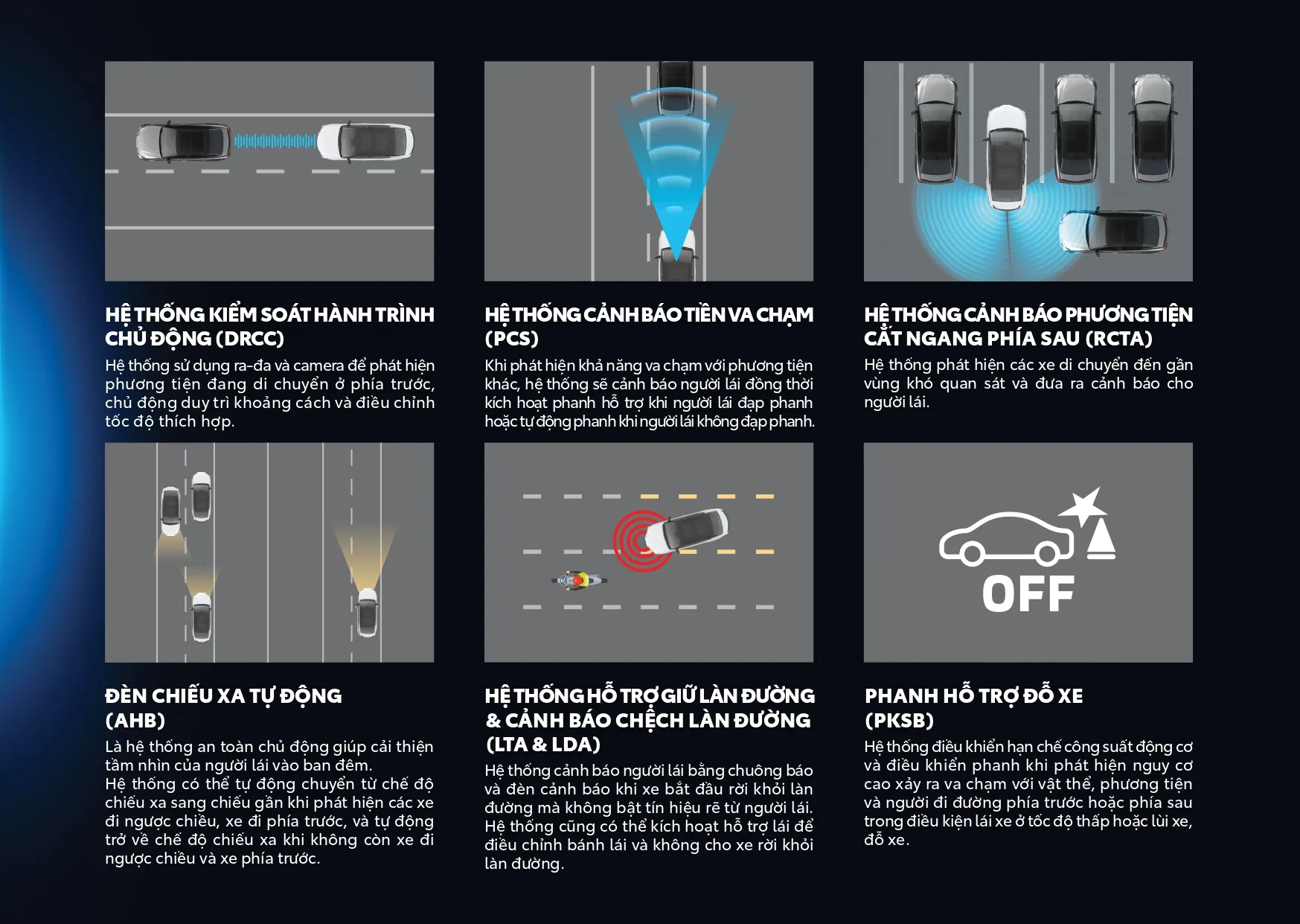 Các tính năng an toàn khác giữ nguyên, như phanh ABS/EBD/BA, cân bằng điện tử, hỗ trợ khởi hành ngang dốc, 8 cảm biến hỗ trợ đỗ xe, cảm biến áp suất lốp, 7 túi khí.