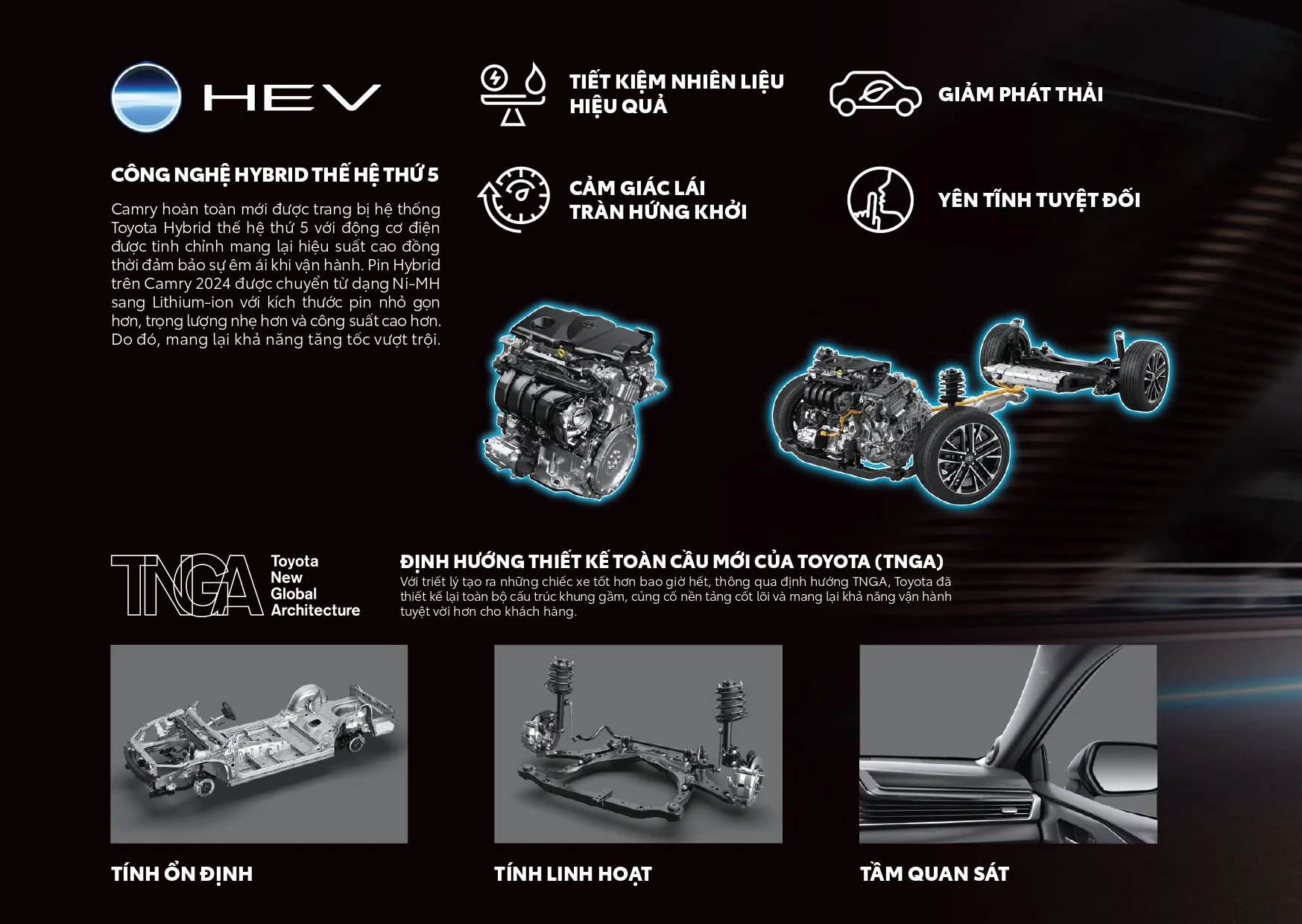 Camry hybrid sử dụng máy xăng 2.5 công suất 185 mã lực, mô-men xoắn cực đại 221 Nm, kết hợp môtơ công suất 134 mã lực, mô-men xoắn 208 Nm.