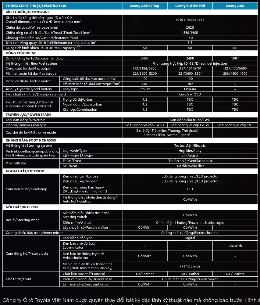 | Camry 2.5 HEV MID: | 1.460.000.000 ₫ |