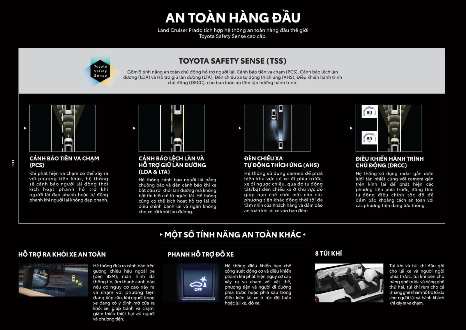 Prado trang bị gói an toàn chủ động (ADAS) Toyota Safety Sense tiêu chuẩn, với các tính năng như cảnh báo tiền va chạm, cảnh báo chệch làn, hỗ trợ giữ làn, điều khiển hành trình thích ứng, cảnh báo điểm mù, cảnh báo phương tiện cắt ngang phía sau.
