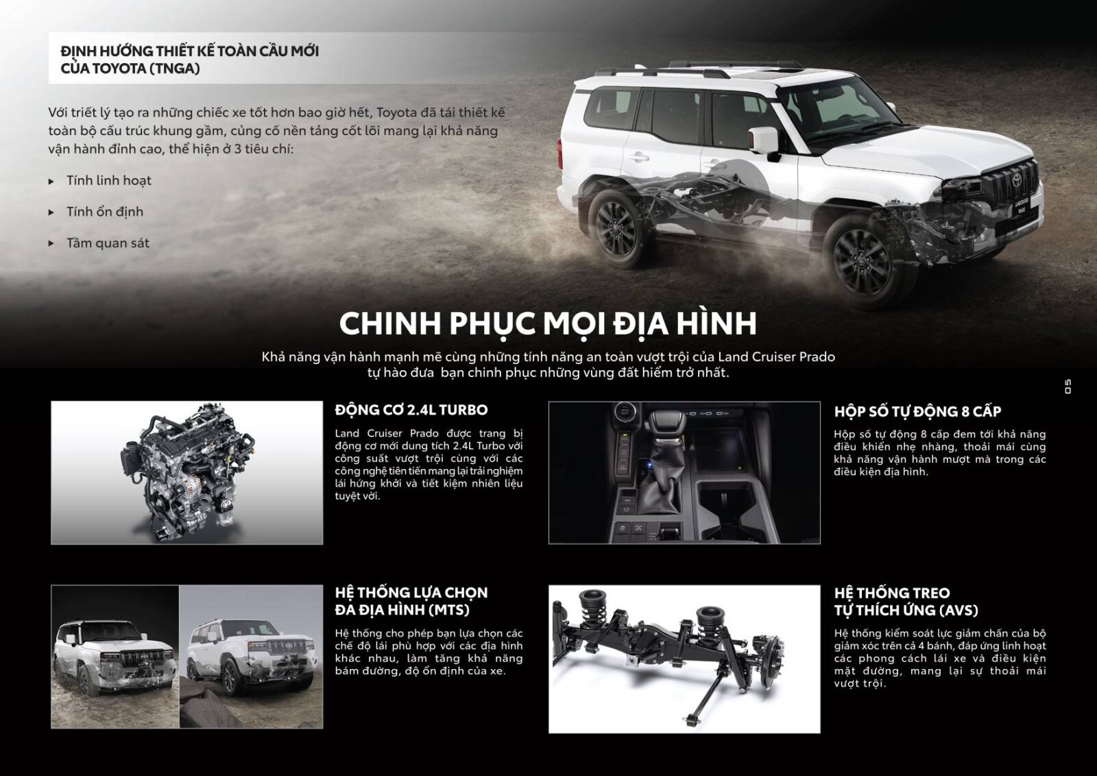 Bỏ động cơ xăng 2.7 cũ công suất 164 mã lực, mô-men xoắn cực đại 246 Nm, Prado 2024 lắp động cơ xăng 2.4, công suất 267 mã lực, mô-men xoắn cực đại 430 Nm. Với động cơ nhỏ hơn nhưng công suất và mô-men xoắn vượt trội thế hệ cũ, Prado mới hứa hẹn vận hành mạnh mẽ hơn, nhẹ cân hơn và tiết kiệm nhiêu liệu hơn.