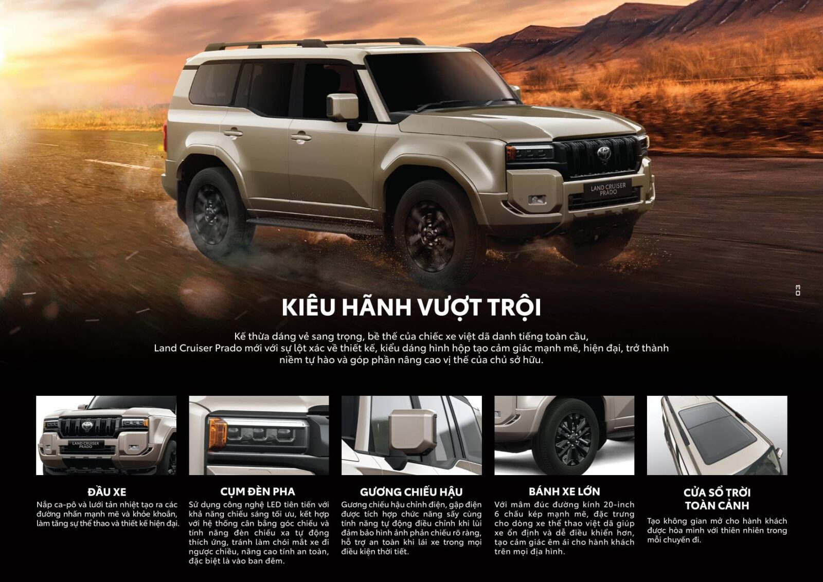Prado thế hệ mới giống đàn anh Toyota Land Cruiser hay Lexus GX, cùng phát triển dựa trên nền tảng khung gầm TNGA. Ở thế hệ mới, Prado mang ngoại hình vuông vức và nam tính hơn thế hệ cũ với nhiều đường cắt gọn tạo hình cơ bắp. Nắp ca-pô kết hợp cùng lưới tản nhiệt với các nan dọc to bản sơn đen. Đèn pha LED hình chữ nhật mới, đi kèm công nghệ thích ứng tự động. Cụm đèn hậu LED tạo hình mới, tăng sức hút.
