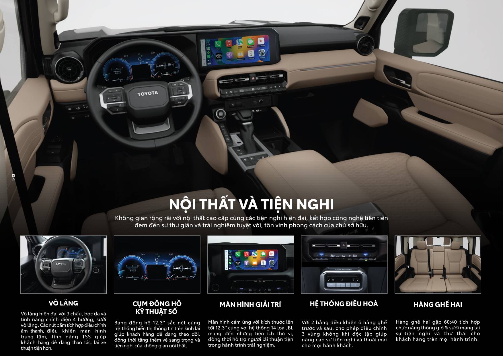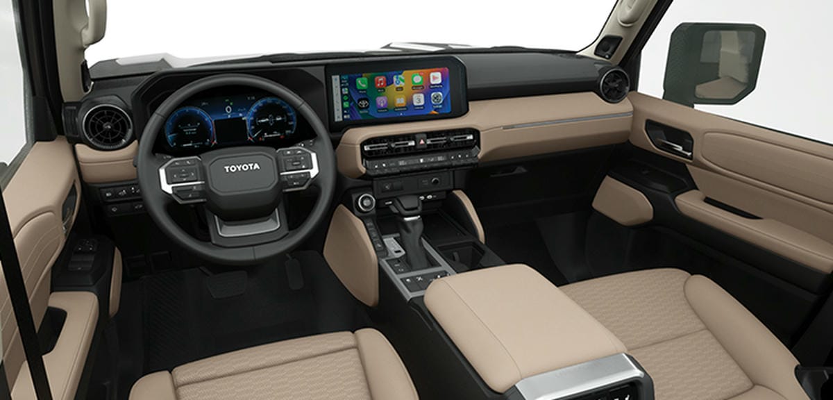 Toyota thiết kế nội thất Prado với nhiều trang bị tiện nghi và hơi hướng sang trọng, cấu hình 7 chỗ. Vô-lăng ba chấu bọc da, chỉnh điện 4 hướng và nhớ vị trí. Bảng đồng hồ với màn hình đa thông tin 12,3 inch với 12 lựa chọn giao diện. Màn hình cảm ứng giải trí 12,3 inch mới, thay cho màn 7 inch trên thế hệ cũ. Hỗ trợ kết nối Apple CarPlay/Android Auto không dây.