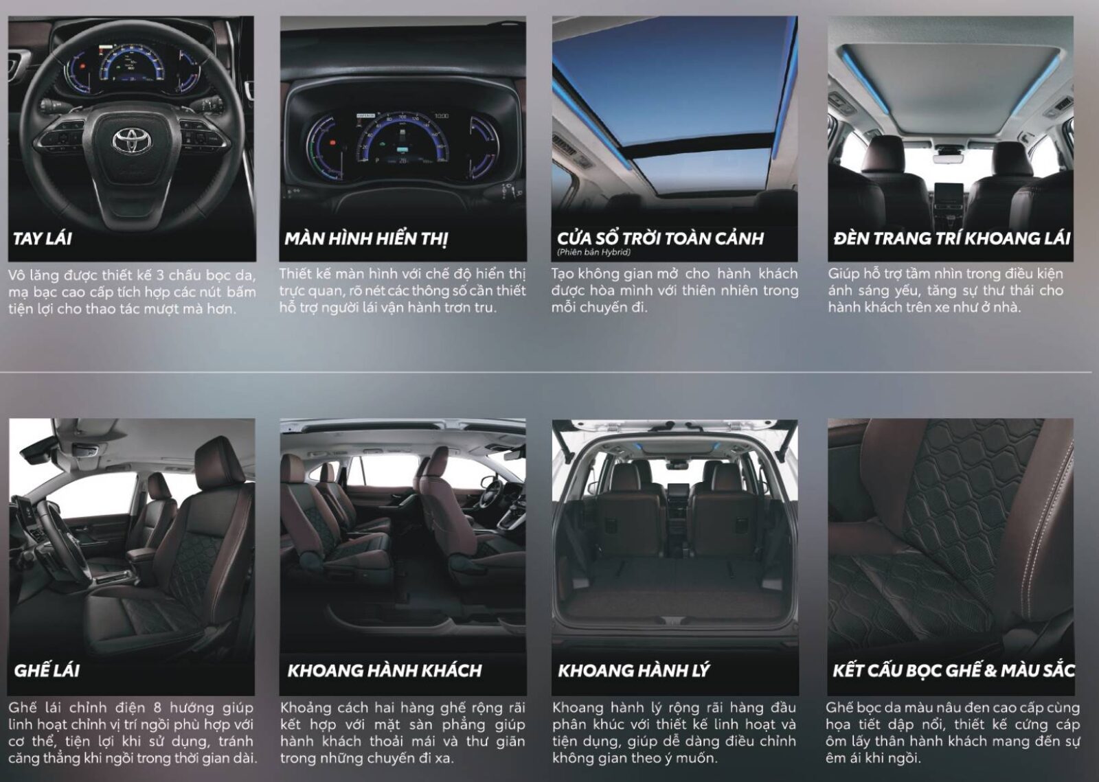 Toyota Innova Cross 2023 có kết cấu 3 hàng ghế với 2 tùy chọn 8 chỗ hoặc 7 chỗ ngồi, tùy phiên bản. Nhờ hướng thiết kế mở nên các không gian hàng ghế đều rộng rãi, mang đến cảm giác thoải mái cho người dùng.