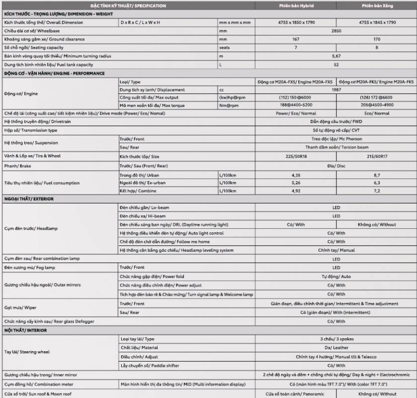 Xe có hai lựa chọn động cơ là xăng và hybrid. Trong đó, bản V lắp động cơ xăng 2.0 công suất 172 mã lực, mô-men xoắn cực đại 205 Nm. Bản hybrid HEV trang bị động cơ xăng 2.0 công suất 150 mã lực, mô-men xoắn 188 Nm, kết hợp một môtơ điện công suất 111 mã lực, mô-men xoắn 206 Nm. Tổng công suất máy xăng và điện là khoảng 183 Nm. Đây là máy full hybrid giống như Camry, tức có chế độ lái thuần điện.