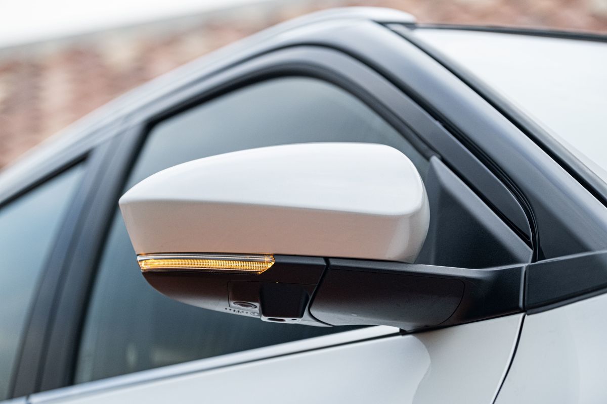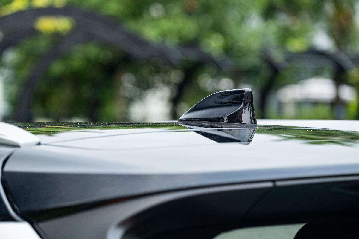 Cửa kính xe sơn đen, bọc bên ngoài là dải viền chrome vuốt dài đến tận cuối trụ C. Phía trên có thanh giá nóc và ăng ten vây cá. Tay nắm cửa cùng màu với thân xe. Gương chiếu hậu nằm chung ở trụ C tích hợp đầy đủ các chức như chỉnh/gập điện, đèn báo rẽ.